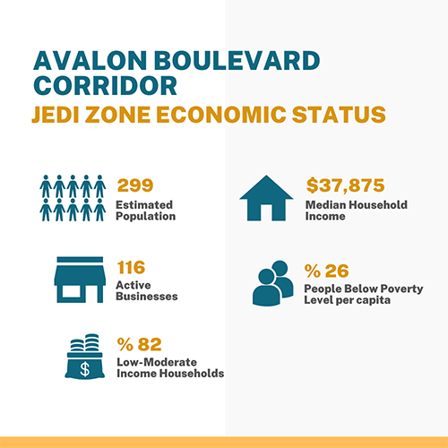 Economic metrics for the Avalon Boulevard Corridor estimated population: 299; active businesses: 116; Low to moderate-income households: 82%; Median household income: $37,875; People below the poverty level per capita: 26%