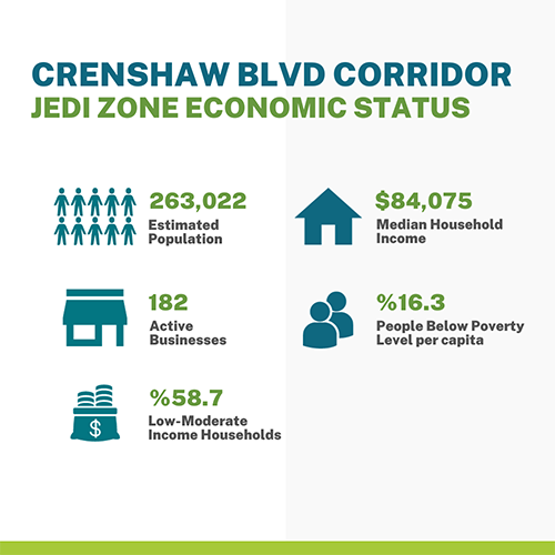 Economic metrics for the Crenshaw Boulevard Corridor estimated population: 9,953; active businesses: 182; Low to moderate-income households: 58.7%; Median household income: $84,075; People below the poverty level per capita: 16.3%