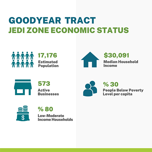 Economic metrics for the Good Year Tract estimated population: 17,176; active businesses: 573; Low to moderate-income households: 80%; Median household income: $30, 091; People below the poverty level per capita: 30%