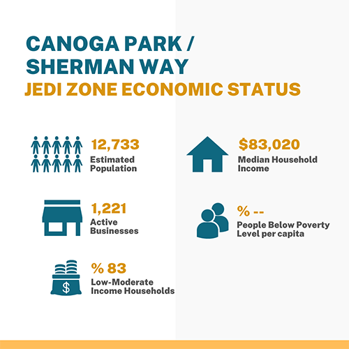 Economic metrics for the Sherman Way corridor in Canoga Park estimated population: 12,733; active businesses: 1,221; Low to moderate-income households: 83%; Median household income: $83,020; People below the poverty level per capita: NA