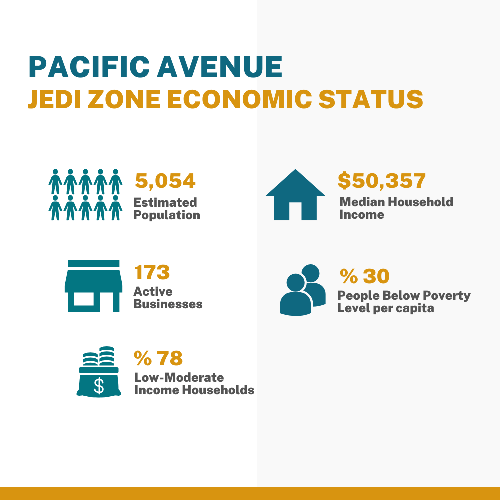 Economic metrics for the Pacific Ave Corridor estimated population: 5,054; active businesses: 173; Low to moderate-income households: 78%; Median household income: $50,357; People below the poverty level per capita: 30%