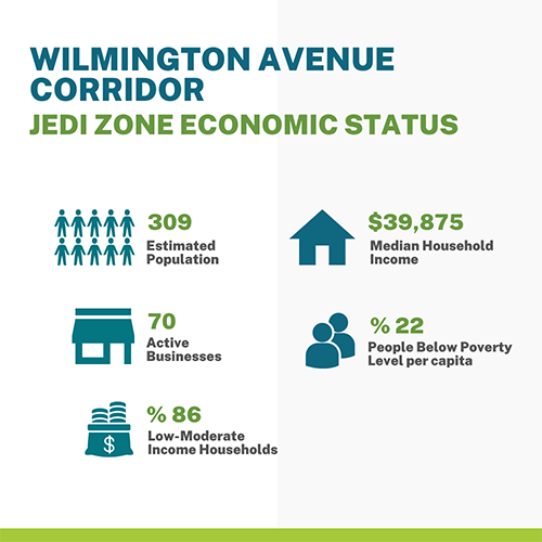 Economic metrics for the Wilmington Avenue tract estimated population: 309; active businesses: 70; Low to moderate income households: 86%; Median household income: $39,875; People below the poverty level per capita: 22%