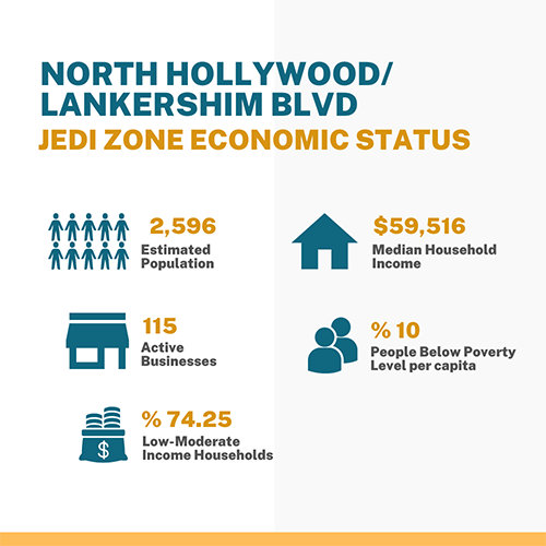 Economic metrics for the North Hollywood/Lankershim area estimated population: 2,596; active businesses: 115; Low to moderate-income households: 74.25%; Median household income: $59,516; People below the poverty level per capita: 10%