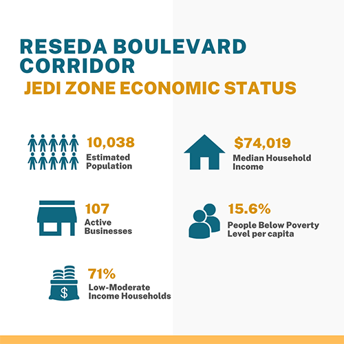Economic metrics for the Reseda Boulevard Corridor estimated population: 10,038; active businesses: 107; Low to moderate-income households: 71%; Median household income: $74,019; People below the poverty level per capita: 15.6%