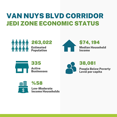 Economic metrics for the Van Nuys Boulevard Corridor estimated population: 263,022; active businesses: 335; Low to moderate-income households: 58%; Median household income: $74,194; People below the poverty level per capita: 38,081
